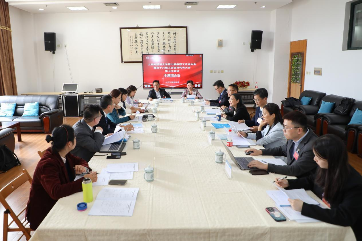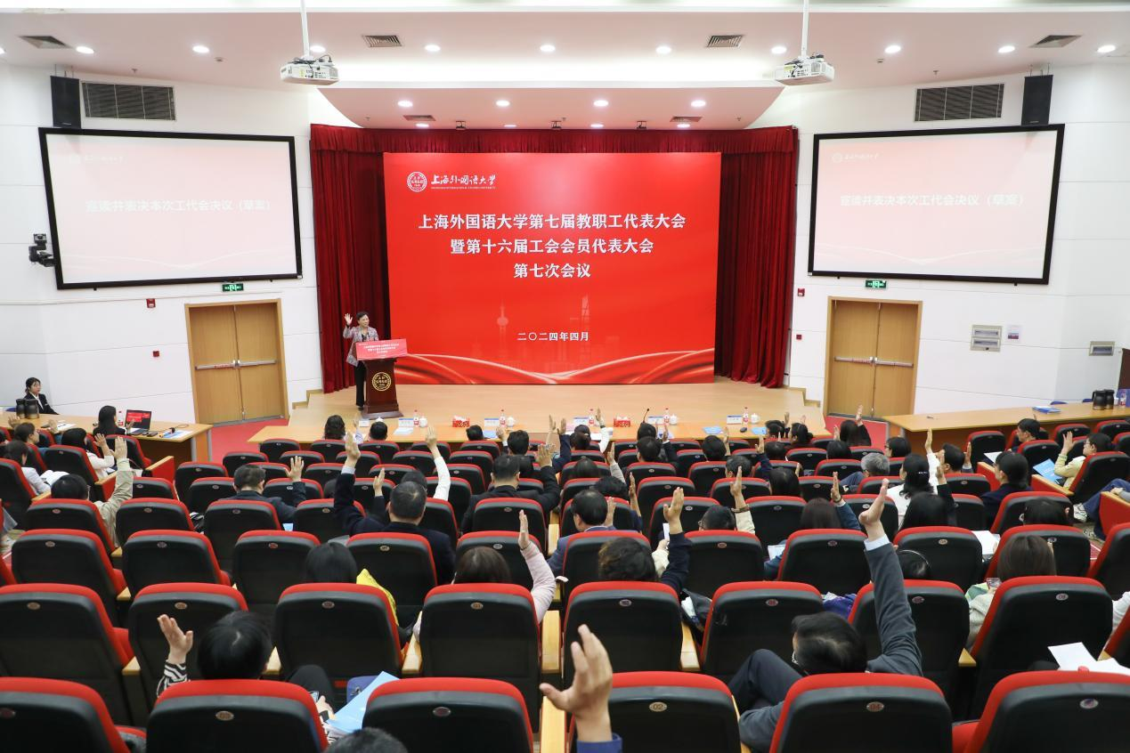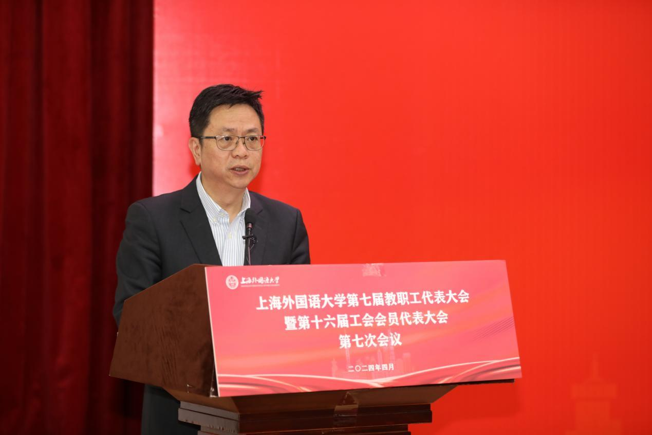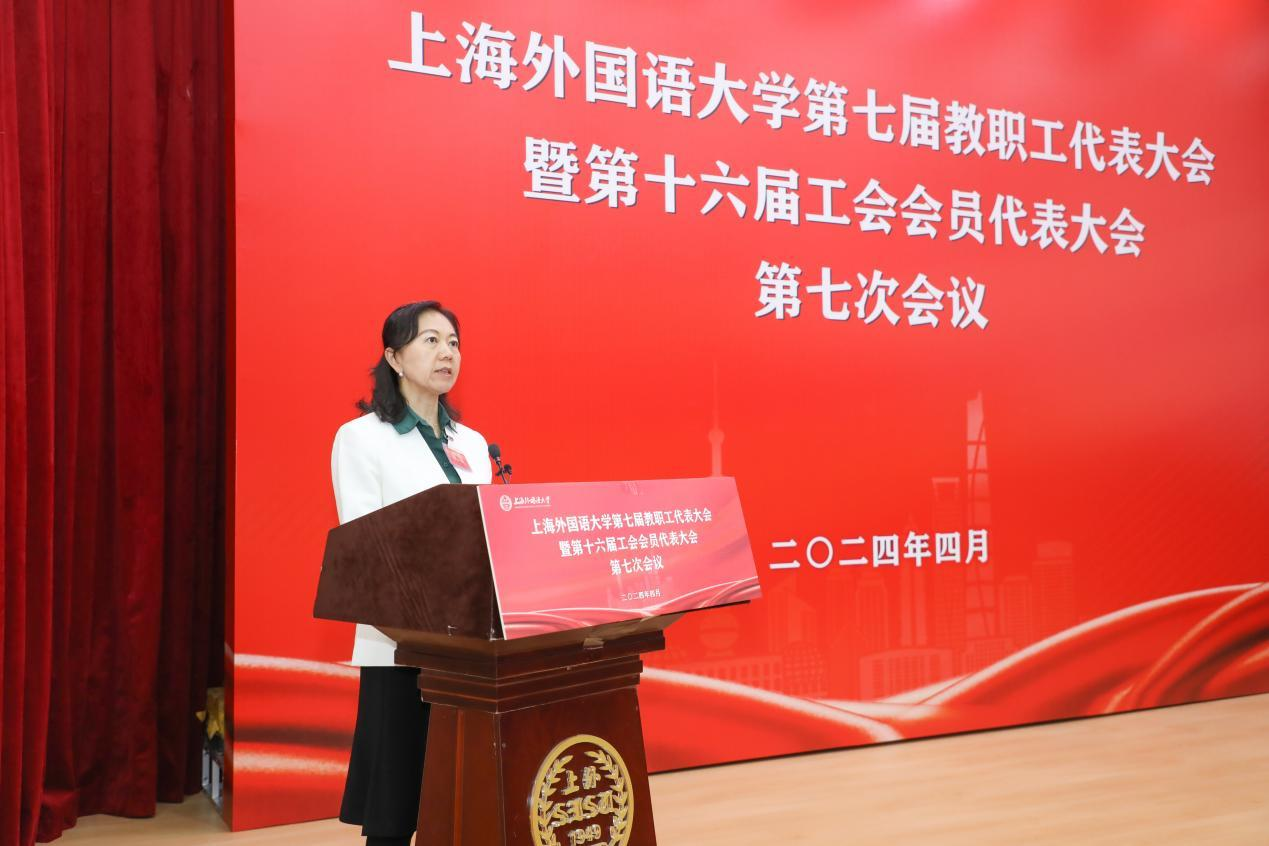2024年4月26日, 上海外国语大学第七届教代会暨第十六届工代会第七次会议在松江校区图文西厅召开。会议总结回顾了2023年学校发展建设情况,并对2024年重点工作作要求部署。校党委书记尹冬梅作总结讲话,校长李岩松作年度工作报告,校党委副书记、工会主席王静主持大会。
