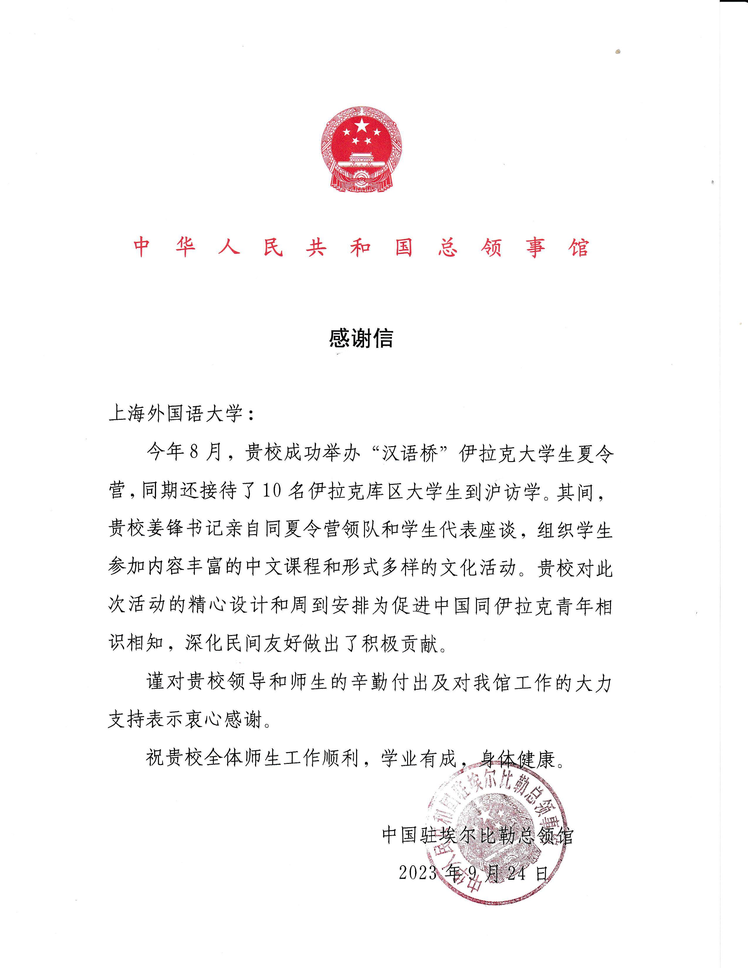 9月24日,中国驻埃尔比勒总领馆专程致信上外,就今年“汉语桥”外国学生夏令营期间学校接待来自伊拉克库尔德地区的学生事宜表示感谢。领馆在信中感谢上外校领导和师生的辛勤付出及对领馆工作的支持,表示“上外对此次活动的精心设计和周到安排为促进中国同伊拉克青年相识相知,深化民间友好做出了积极贡献”。